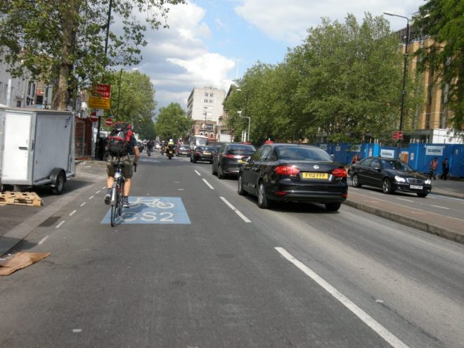 Peckham High Street. Plans to make it into a conservation area have recently been approved, and CS5 is due to open next year, but is there enough space here for segregated cycling facilities?